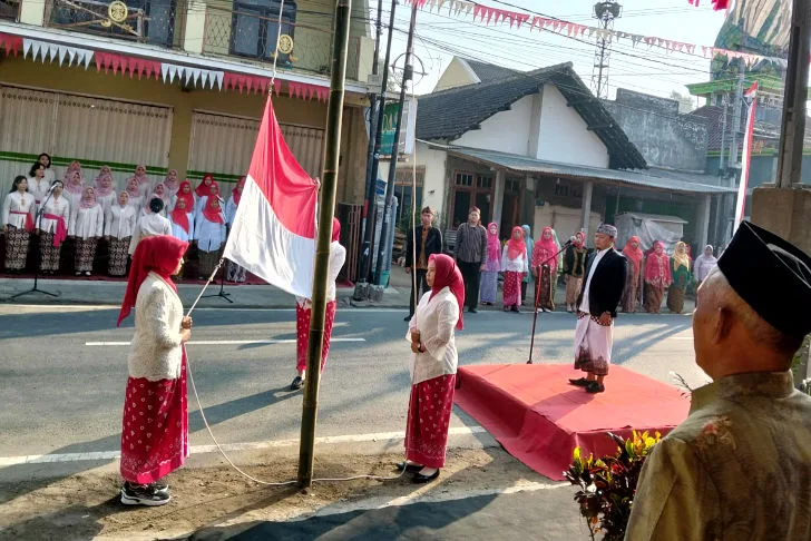 Ratusan warga RW 5 dan RW 6, dengan mengenakan pakaian tradisional, mengikuti upacara pengibaran Bendera Merah Putih di tengah jalan lingkungan mereka pada Minggu (17 Agustus 2025).